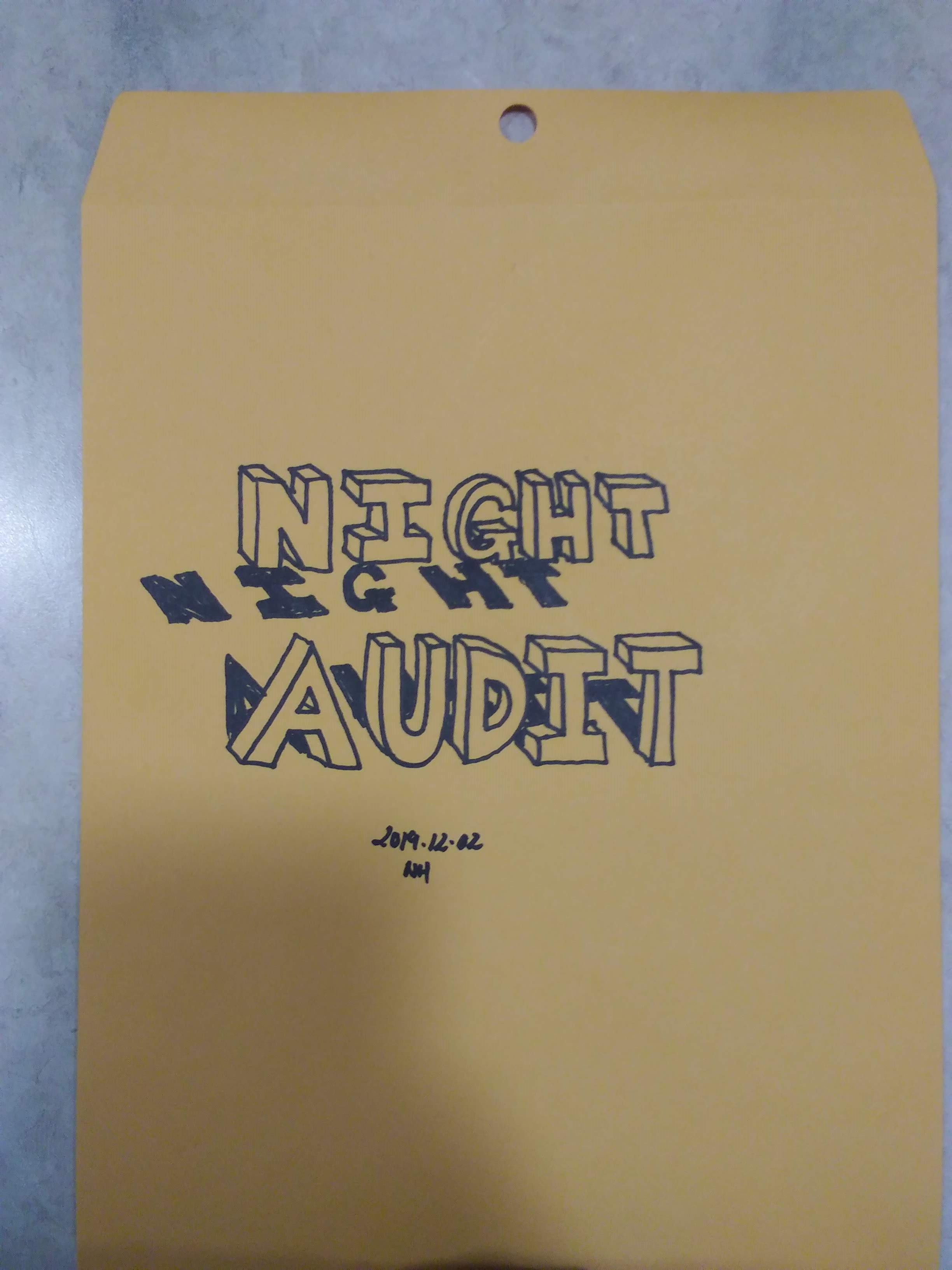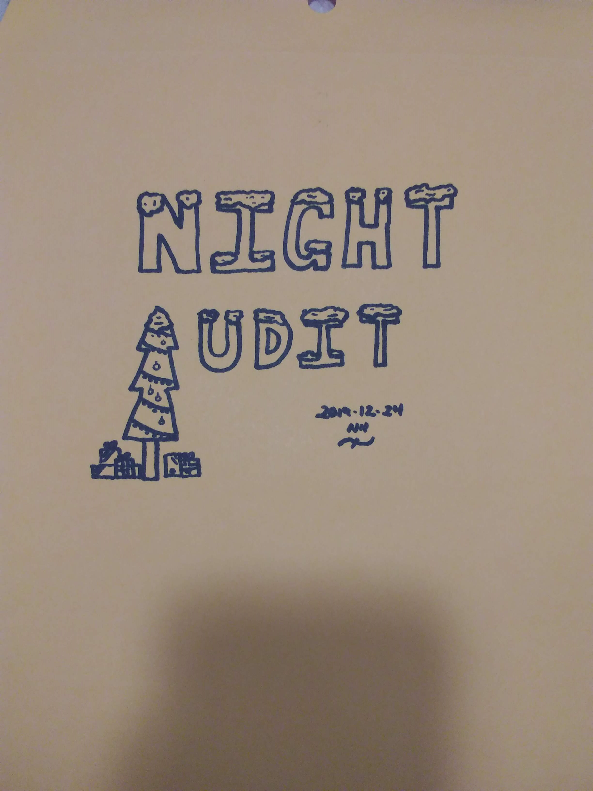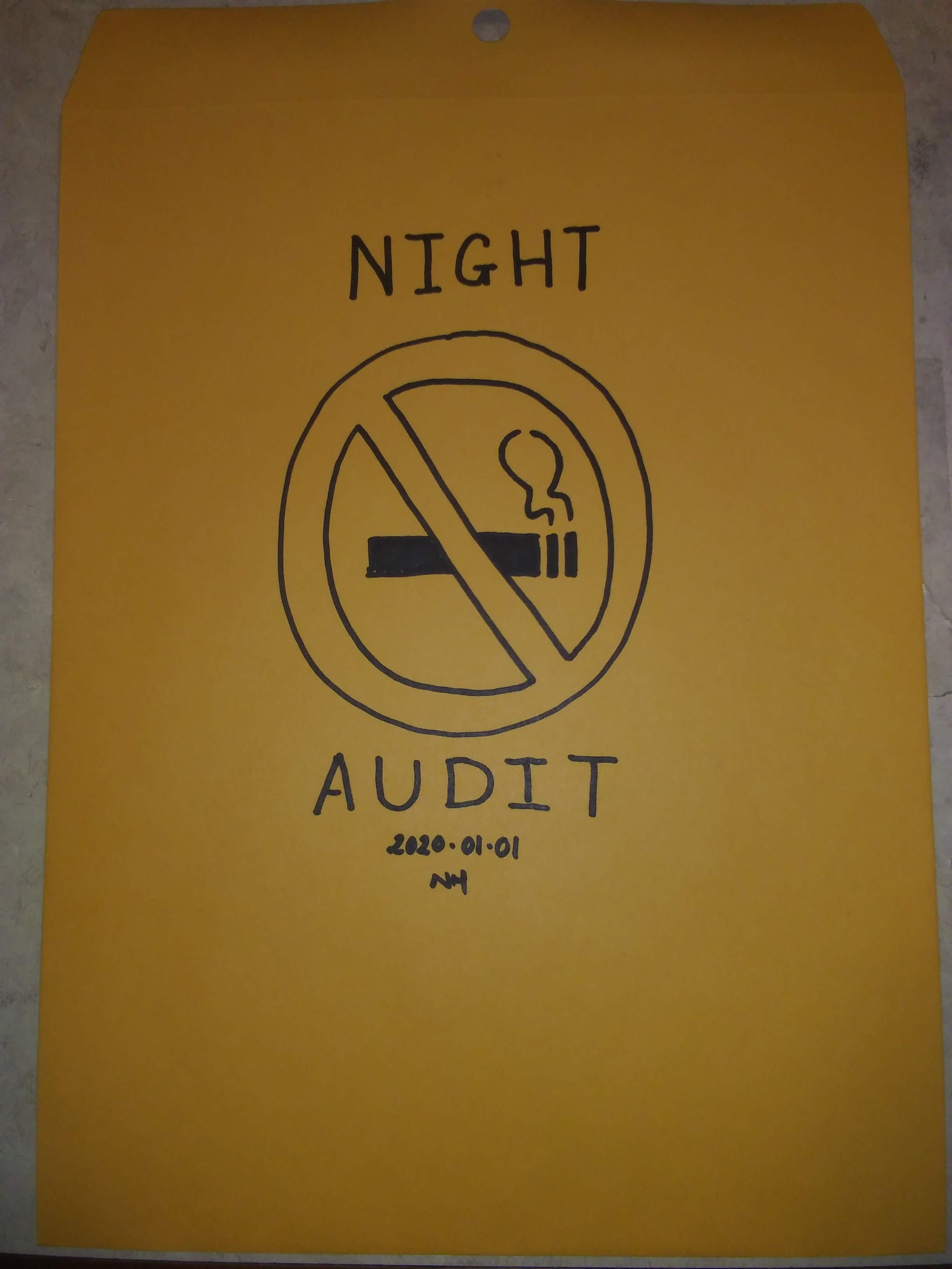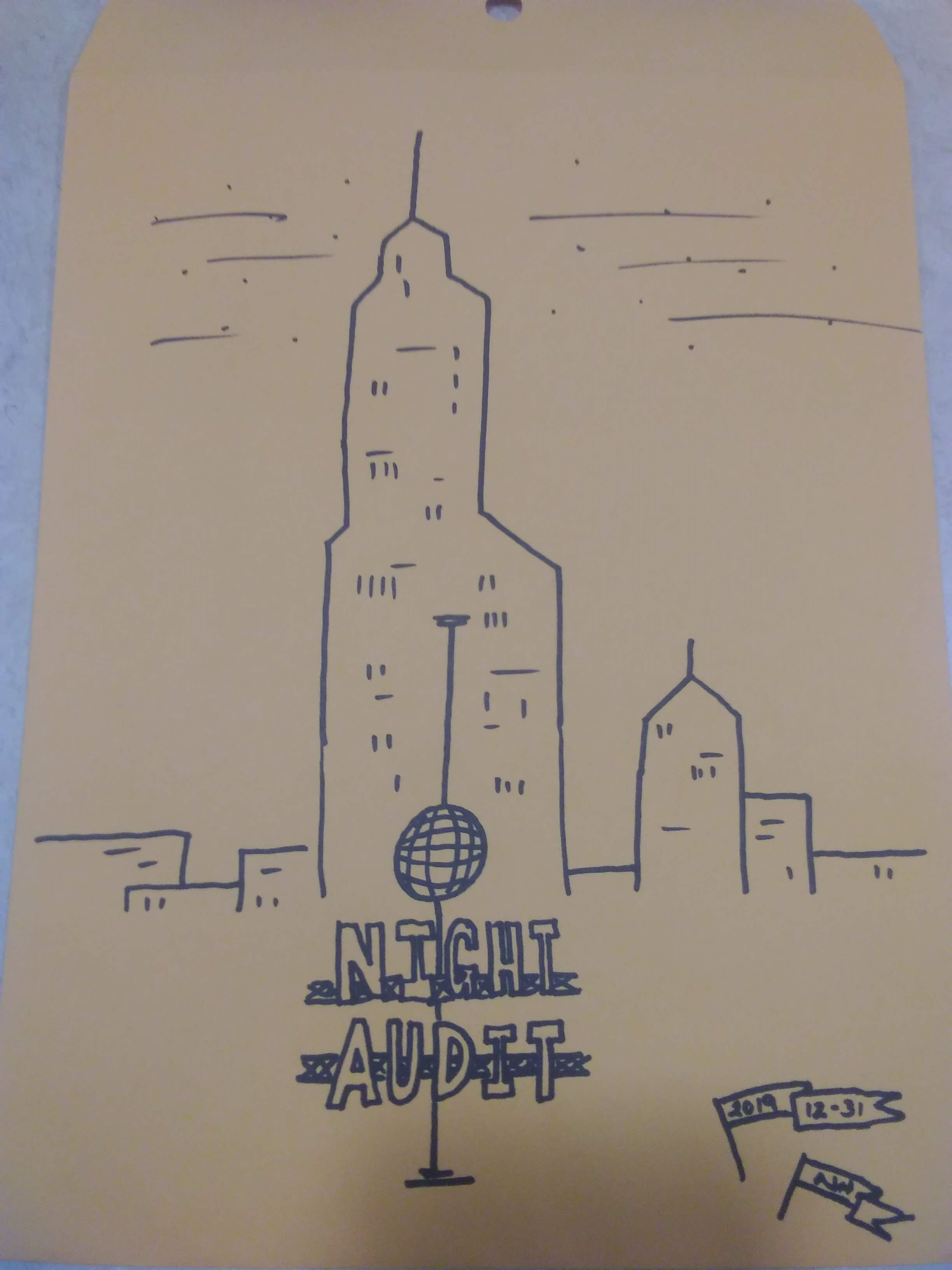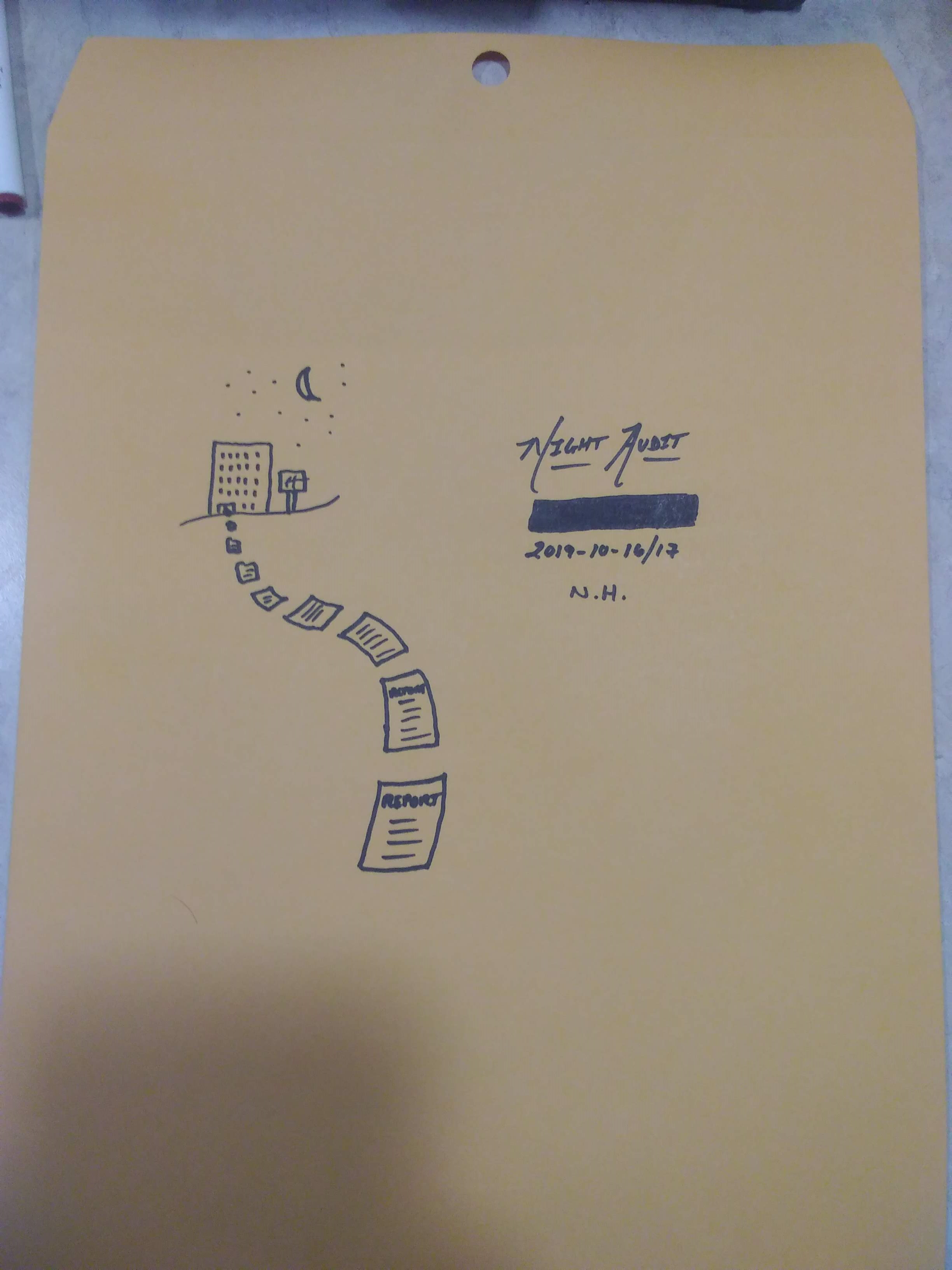 The envelopes we use to prepare our audit packets start off blank. We are required to write "Night Audit", the date, and our initials on it. When I started doing relief audits here I resolved to do something creative with each packet and to do something different every time.